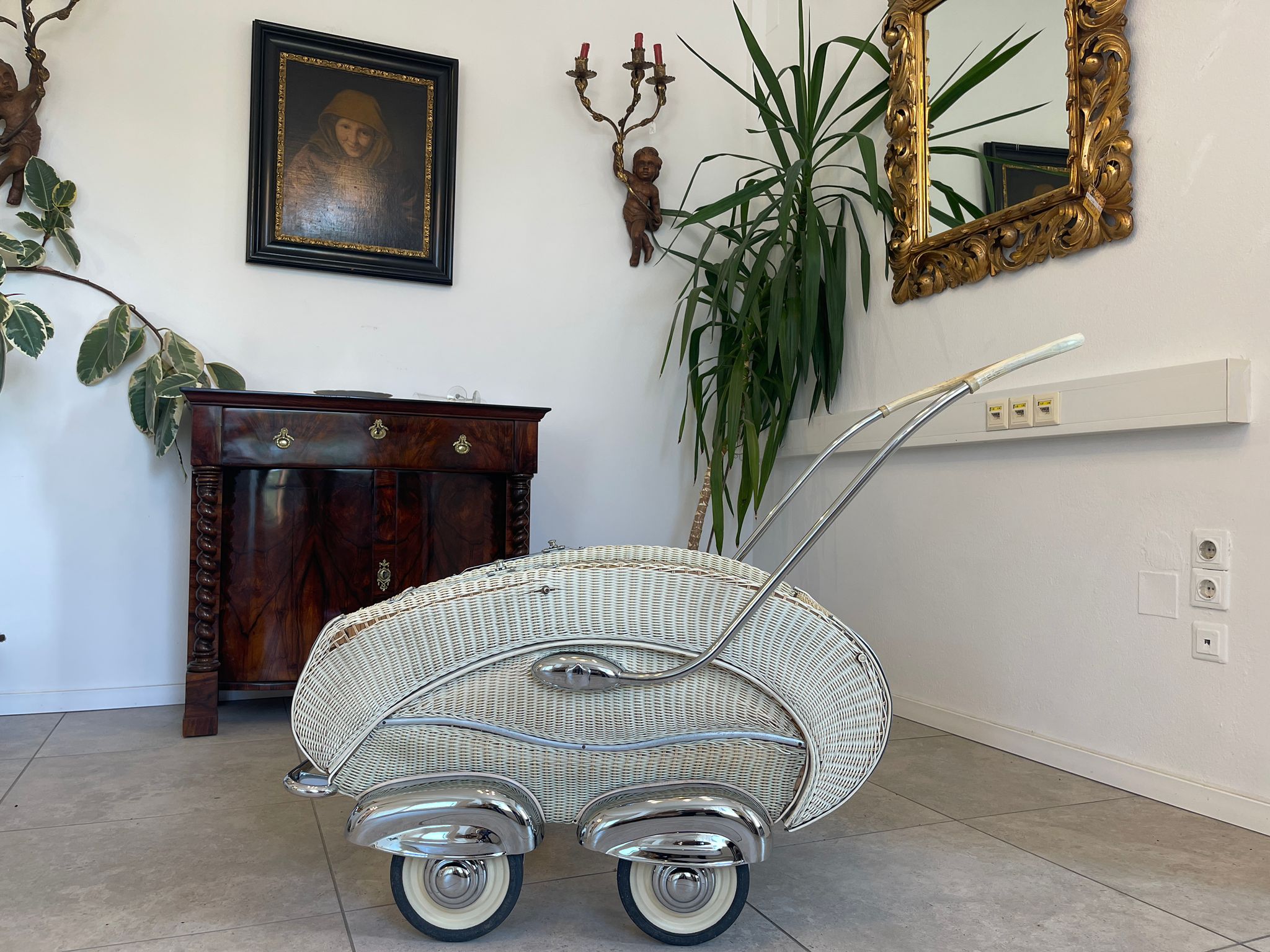 Zum Verkauf steht ein originaler restaurierter Vintage Wicker Kinderwagen Buggy aus den 1960er bis 1970er Jahren. Dieser wunderschöne Korbpuppenwagen kombiniert Nostalgie mit handwerklicher Präzision und ist ein zeitloses Stück, das Generationen begeistert.